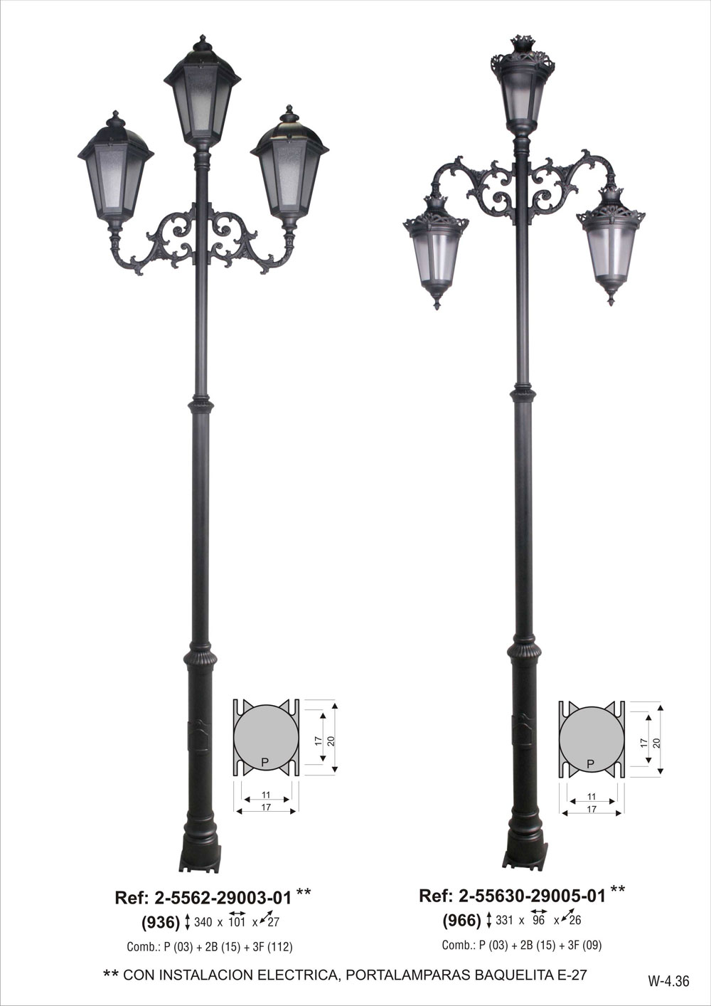 CON INSTALACION ELECTRICA, portalámparas E-27. Combinación pie tres tramos chica de 290 cm de altura (2-5103-290) + 2 brazos de fundición de aluminio grandes (2-9115-34) + 3 faroles redondos en fundición de aluminio con difusor ácido de policarbonato (2-4609-3905). Pintado en poliéster termo endurecido. Acabados más habituales en negro, oxirón y verde carruaje.