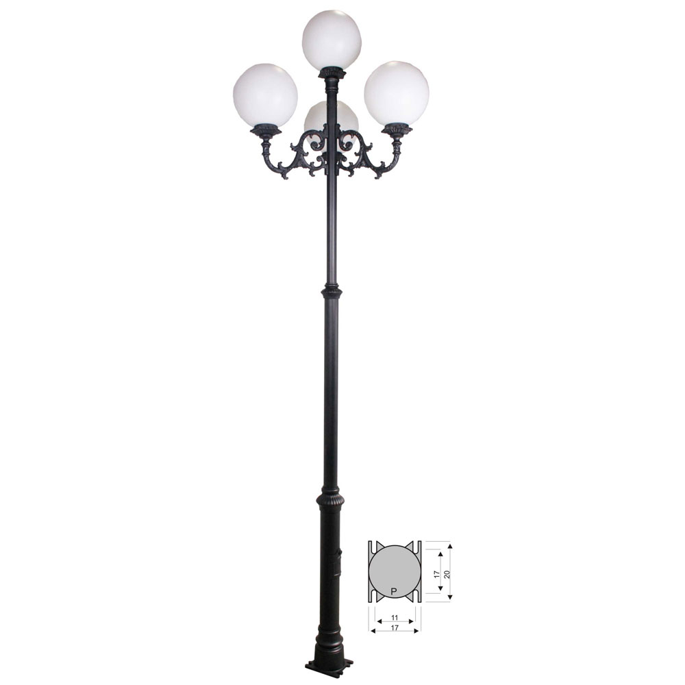 CON INSTALACION ELECTRICA, portalámparas E-27. Combinación pie tres tramos chica de 290 cm de altura (2-5103-290) + 2 brazos de fundición de aluminio grandes (2-9115-34) + 3 bolas de polietileno de 30cm de diámetro (2-49011-30) + 3 platos de aluminio (2-4926-27). Pintado en poliéster termo endurecido. Acabados más habituales en negro, oxirón y verde carruaje.