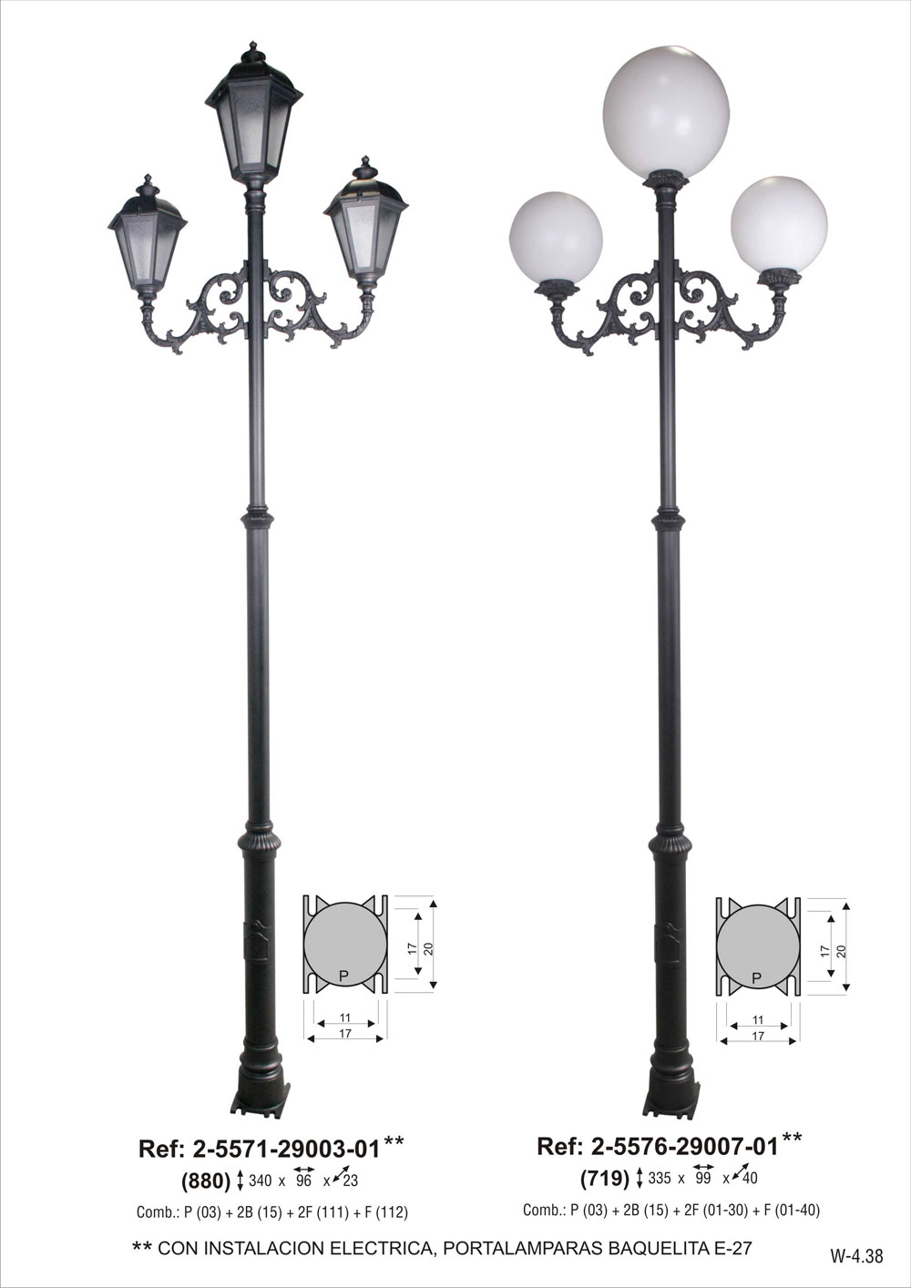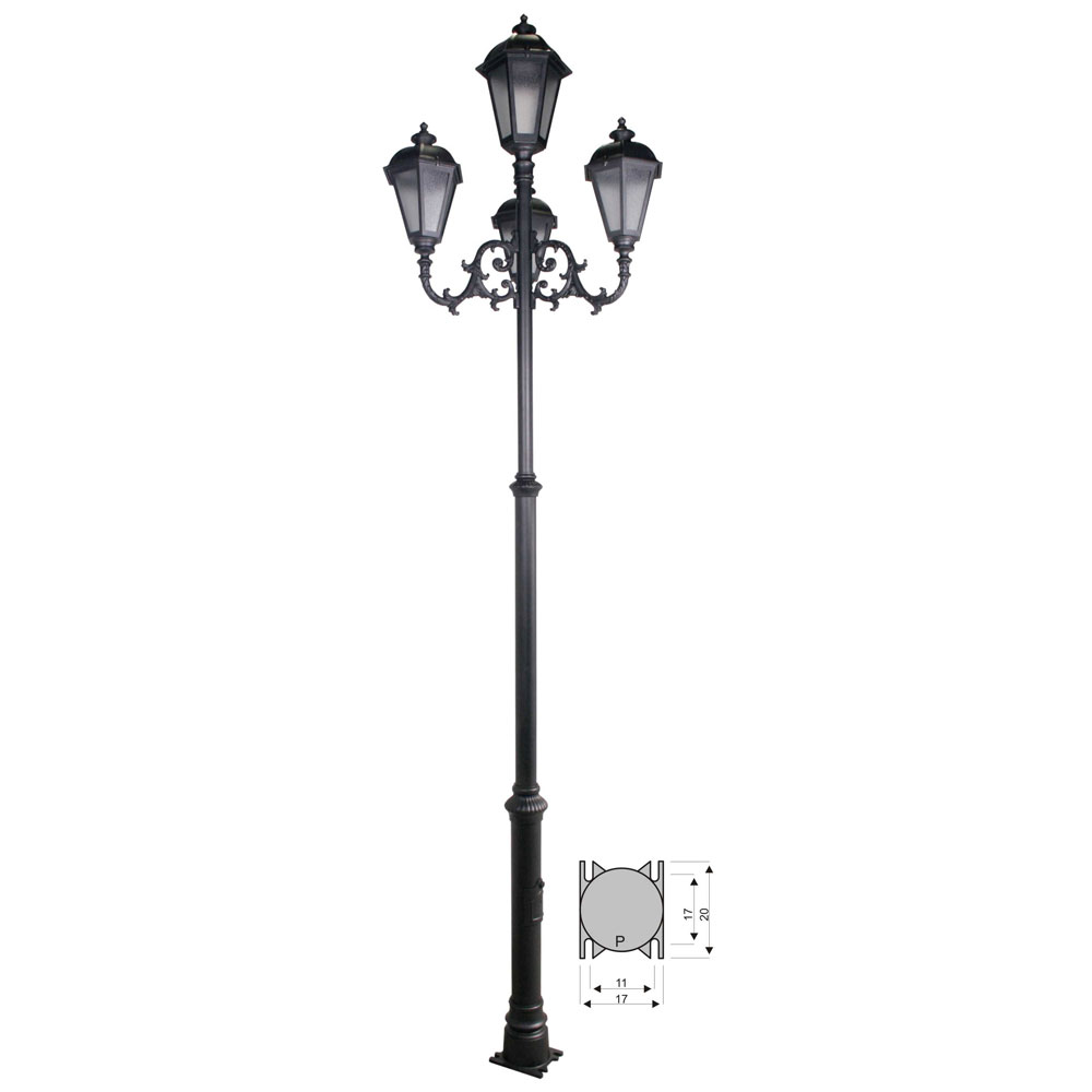CON INSTALACION ELECTRICA, portalámparas E-27. Combinación pie tres tramos chica de 290 cm de altura (2-5103-290) + 2 brazos de fundición de aluminio grandes (2-9115-34) + 2 faroles de 6 caras chico de aluminio fundido con vidrio carglas (2-4611-3603) + 1 farol de 6 caras grande de aluminio fundido con vidrio carglas (2-4611-4803). Pintado en poliéster termo endurecido. Acabados más habituales en negro, oxirón y verde carruaje.