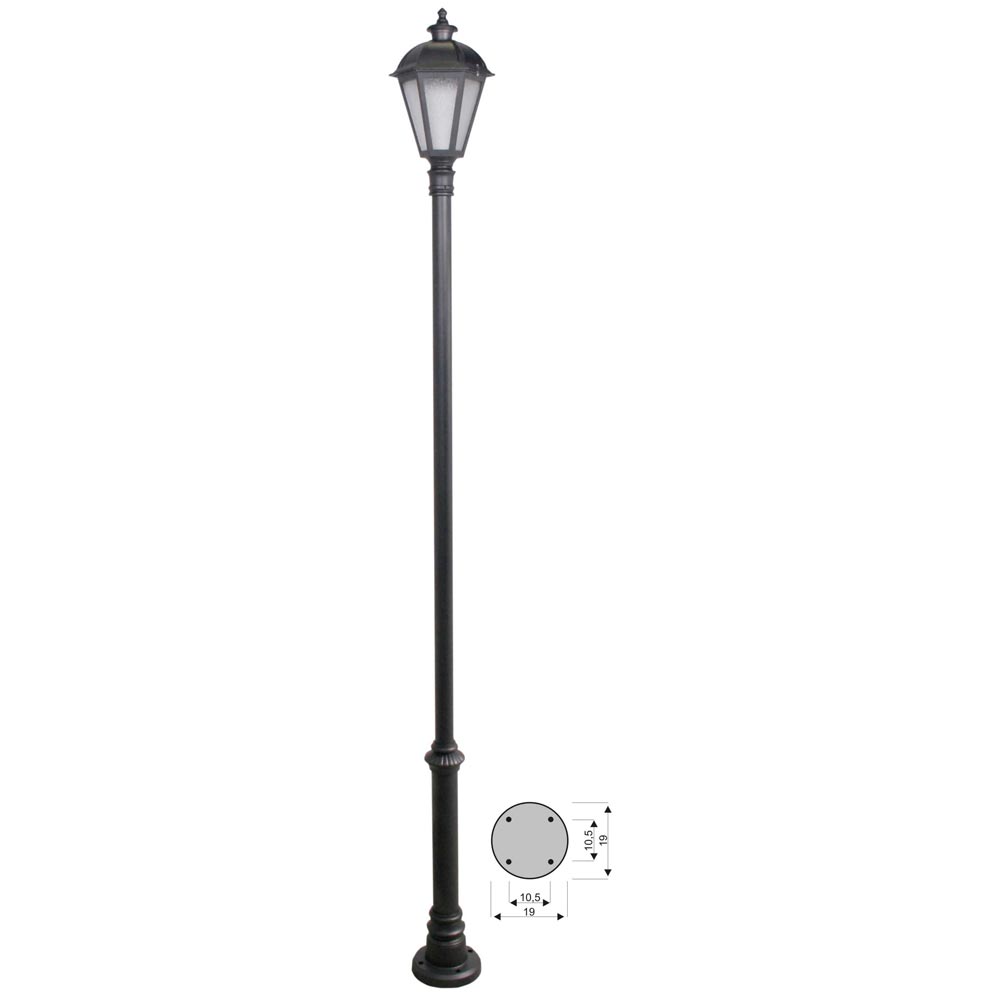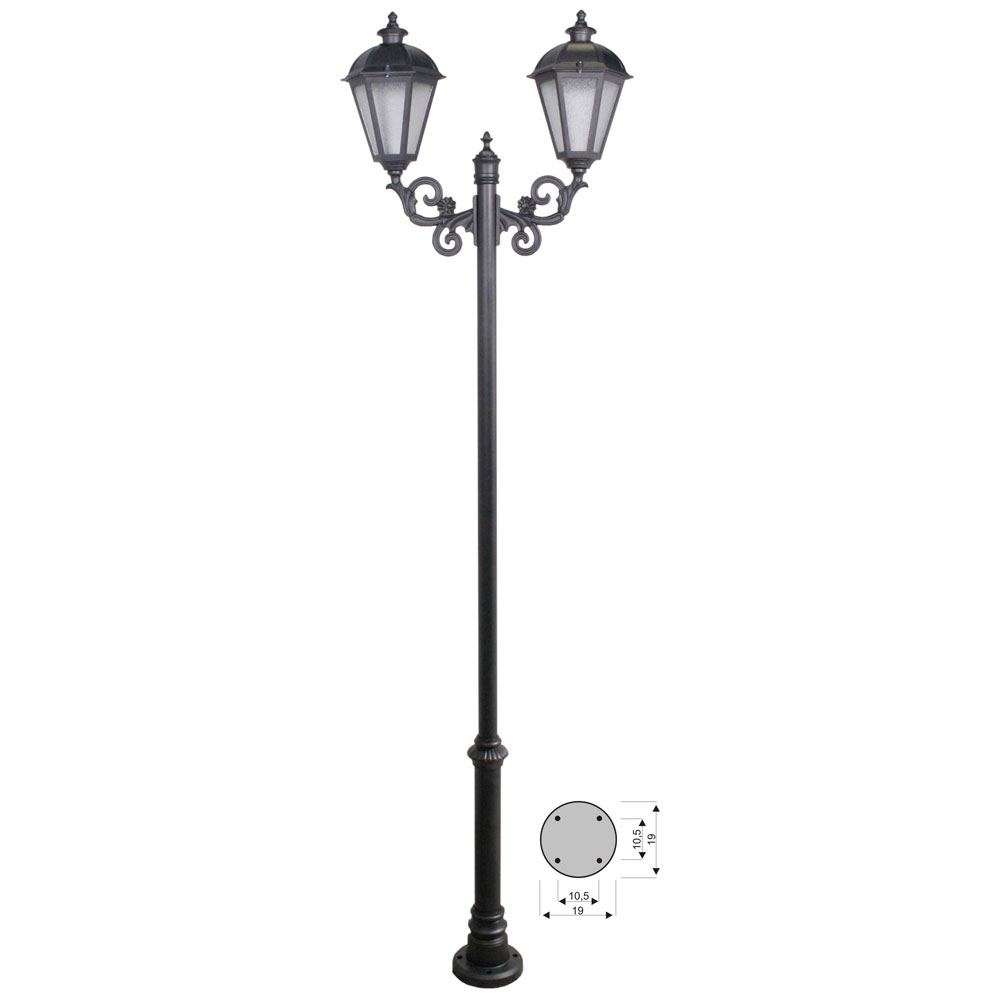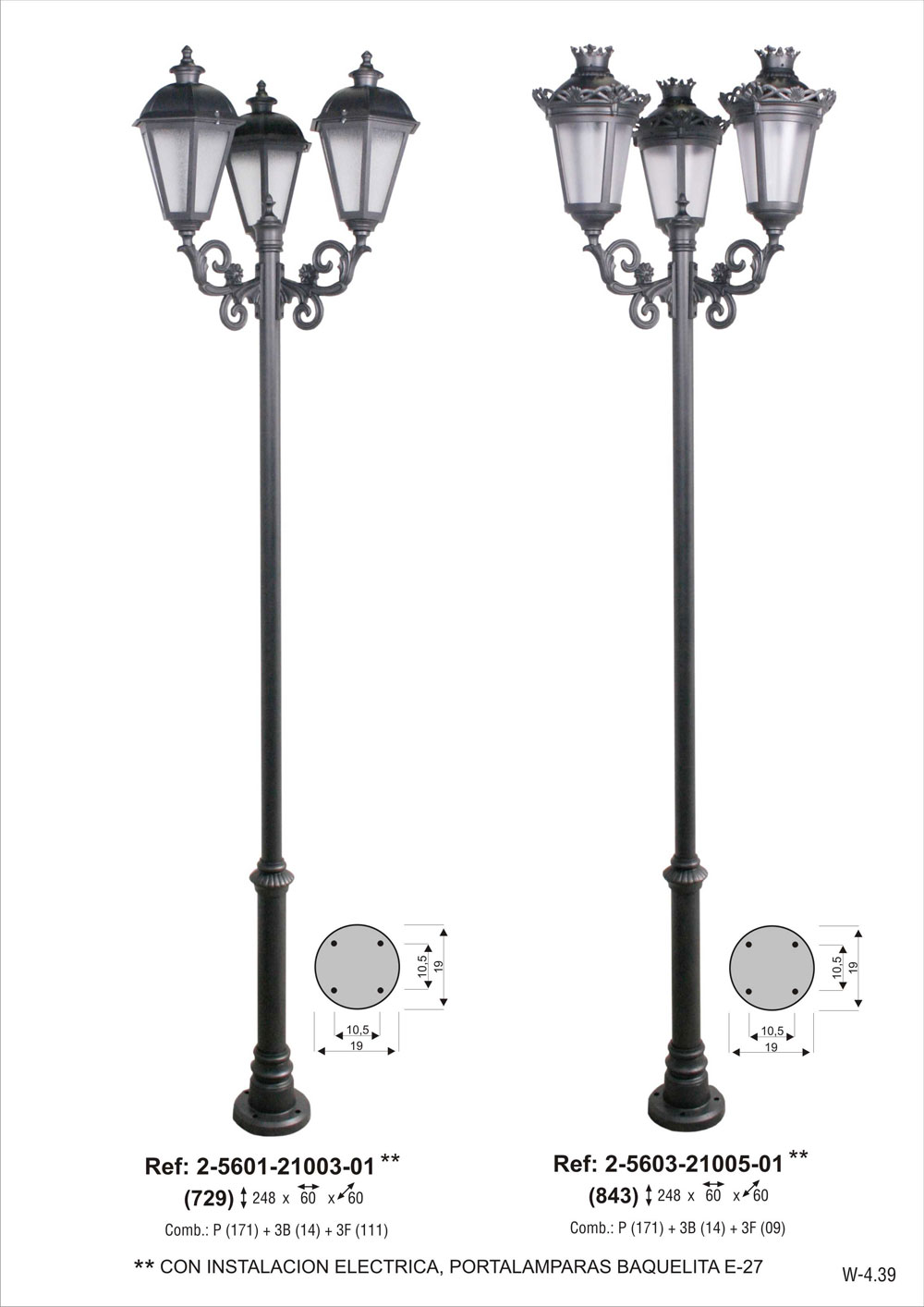 CON INSTALACION ELECTRICA, portalámparas E-27. Combinación pie dos tramos chica de 210 cm de altura (2-5117-210) + 3 brazos de fundición de aluminio chicos (2-9114-22) + 3 faroles de 6 caras chico de aluminio fundido con vidrio carglas (2-4611-3603). Pintado en poliéster termo endurecido. Acabados más habituales en negro, oxirón y verde carruaje.