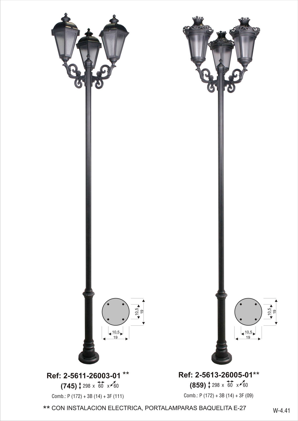 CON INSTALACION ELECTRICA, portalámparas E-27. Combinación pie dos tramos chica de 260 cm de altura (2-5117-260) + 3 brazos de fundición de aluminio chicos (2-9114-22) + 3 faroles de 6 caras chico de aluminio fundido con vidrio carglas (2-4611-3603). Pintado en poliéster termo endurecido. Acabados más habituales en negro, oxirón y verde carruaje.