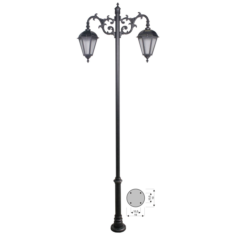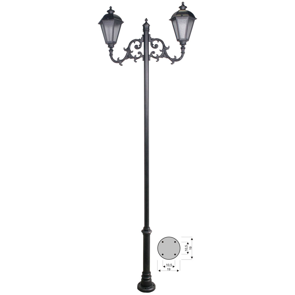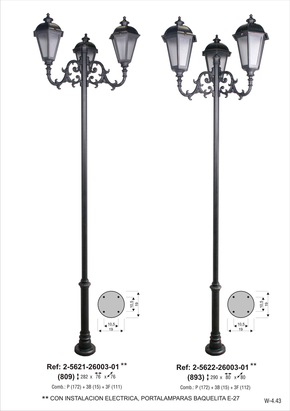 CON INSTALACION ELECTRICA, portalámparas E-27. Combinación pie dos tramos chica de 260 cm de altura (2-5117-260) + 3 brazos de fundición de aluminio grandes (2-9115-34) + 3 faroles de 6 caras chico de aluminio fundido con vidrio carglas (2-4611-3603). Pintado en poliéster termo endurecido. Acabados más habituales en negro, oxirón y verde carruaje.