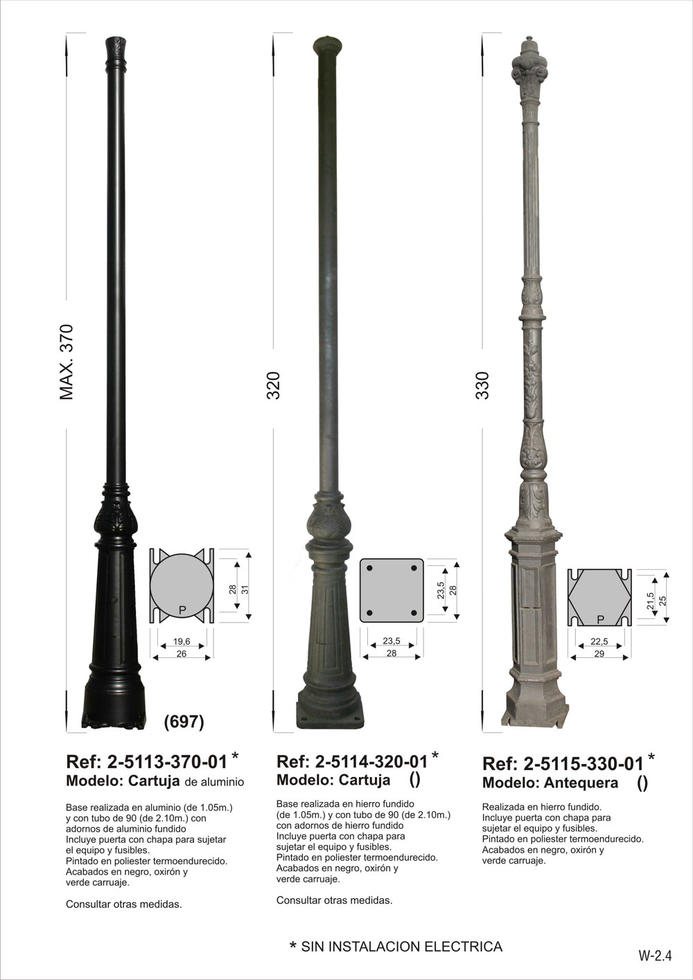 SIN INSTALACION ELECTRICA. Columna modelo Cartuja. Realizada en hierro fundido (de 1.05M) y con tubo redondo de 90 (de 2.15M) con adornos de hierro fundido. Incluye puerta con chapa soldada para sujetar el equipo y fusibles. Pintado en poliéster termo endurecido. Acabados más habituales en negro, oxirón y verde carruaje. Consultar otras medidas.