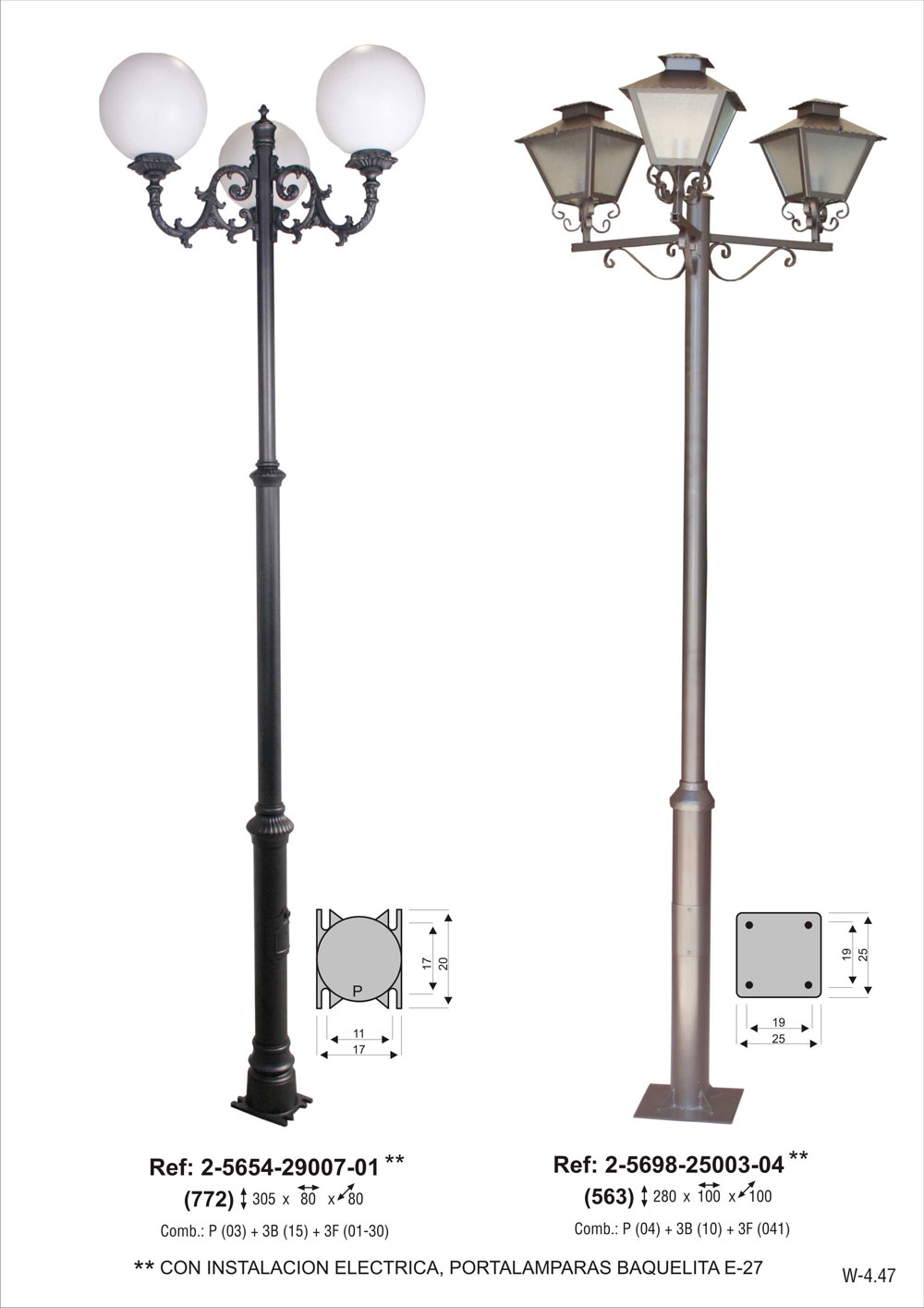 CON INSTALACION ELECTRICA, portalámparas E-27. Combinación pie osuna de 395 cm de altura (2-5104-395) + 3 brazos de tubo y pletina (2-9110-60) + 3 faroles de chapa de acero chicos con vidrio carglas (2-4604-3603). Pintado en poliéster termo endurecido. Acabados más habituales en negro, oxirón y verde carruaje.