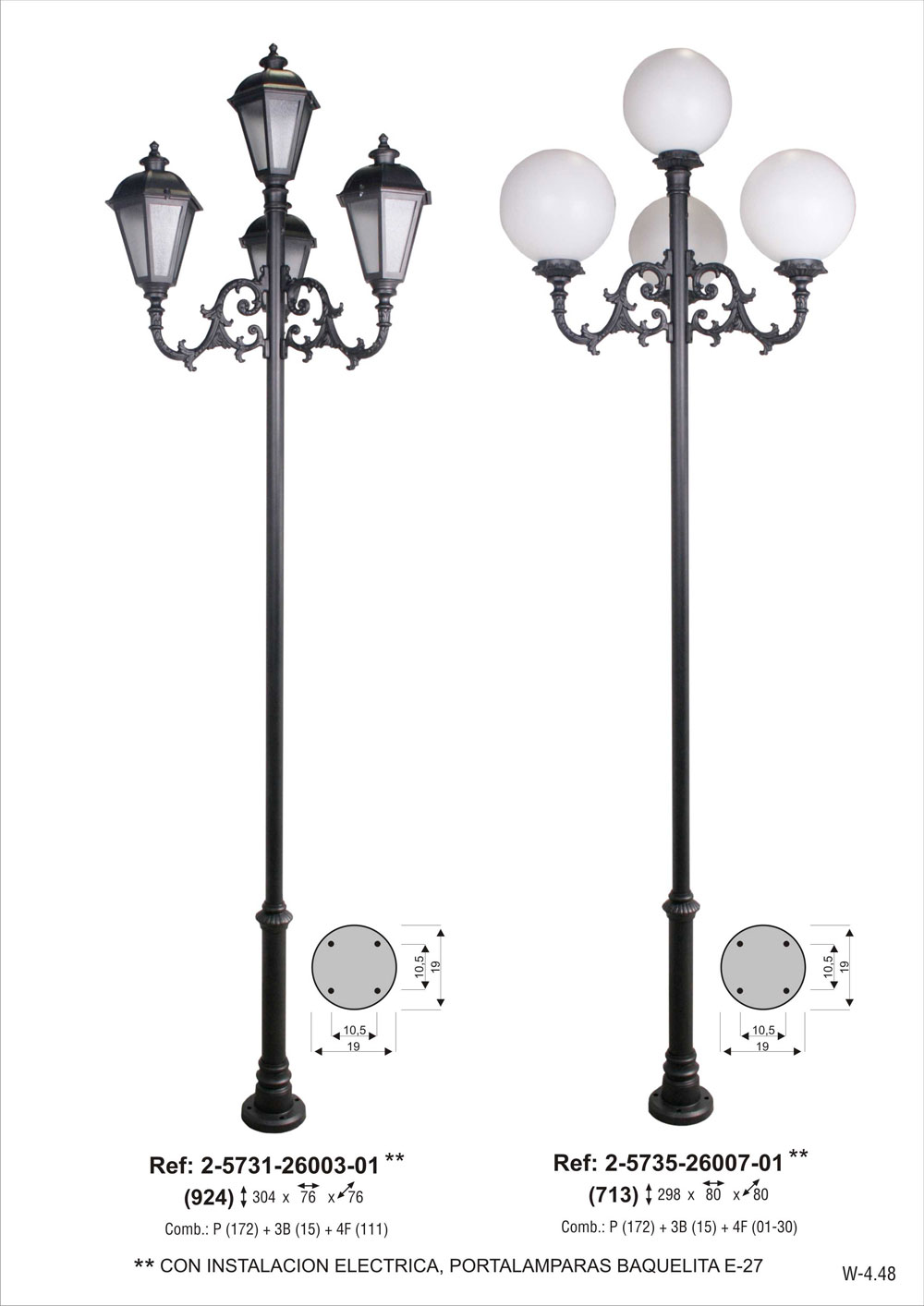 CON INSTALACION ELECTRICA,portalámparas E-27. Combinación pie dos tramos chica de 260 cm de altura (2-5117-260) + 3 brazos de fundición de aluminio grandes (2-9115-34) + 4 bolas de polietileno de 30cm de diámetro (2-49011-30) + 4 platos de aluminio (2-4926-27). Pintado en poliéster termo endurecido. Acabados más habituales en negro, oxirón y verde carruaje.