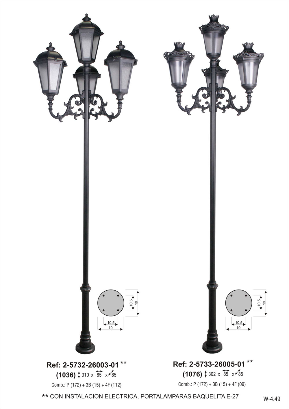 CON INSTALACION ELECTRICA, portalámparas E-27. Combinación pie dos tramos chica de 260 cm de altura (2-5117-260) + 3 brazos de fundición de aluminio grandes (2-9115-34) + 4 faroles de 6 caras grande de aluminio fundido con vidrio carglas (2-4611-4803). Pintado en poliéster termo endurecido. Acabados más habituales en negro, oxirón y verde carruaje.