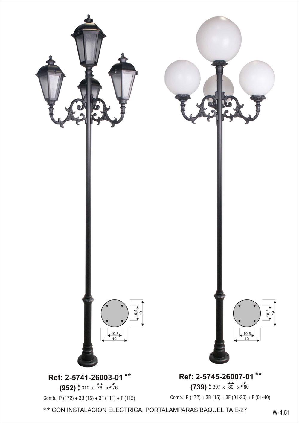 CON INSTALACION ELECTRICA, portalámparas E-27. Combinación pie dos tramos chica de 260 cm de altura (2-5117-260) + 3 brazos de fundición de aluminio grandes (2-9115-34) + 3 faroles de 6 caras chico de aluminio fundido con vidrio carglas (2-4611-3603) + farol de 6 caras grande de aluminio fundido con vidrio carglas (2-4611-4803). Pintado en poliéster termo endurecido. Acabados más habituales en negro, oxirón y verde carruaje.