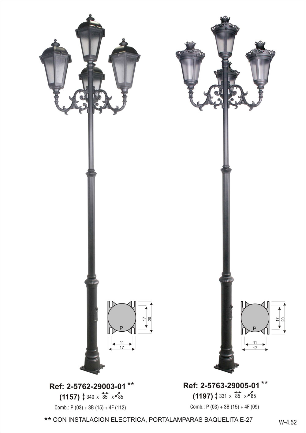 CON INSTALACION ELECTRICA, portalámparas E-27. Combinación pie tres tramos chica de 290 cm de altura (2-5103-290) + 3 brazos de fundición de aluminio grandes (2-9115-34) + 4 faroles de 6 caras grande en aluminio fundido con vidrio carglas (2-4611-4803). Pintado en poliéster termo endurecido. Acabados más habituales en negro, oxirón y verde carruaje.