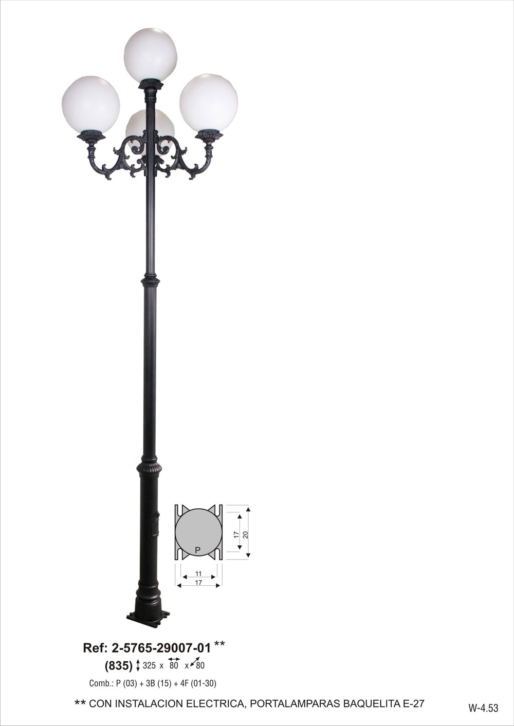 CON INSTALACION ELECTRICA, portalámparas E-27. Combinación pie tres tramos chica de 290 cm de altura (2-5103-290) + 3 brazos de fundición de aluminio grandes (2-9115-34) + 4 bolas de polietileno de 30cm de diámetro (2-49011-30) + 4 platos de aluminio (2-4926-27). Pintado en poliéster termo endurecido. Acabados más habituales en negro, oxirón y verde carruaje.