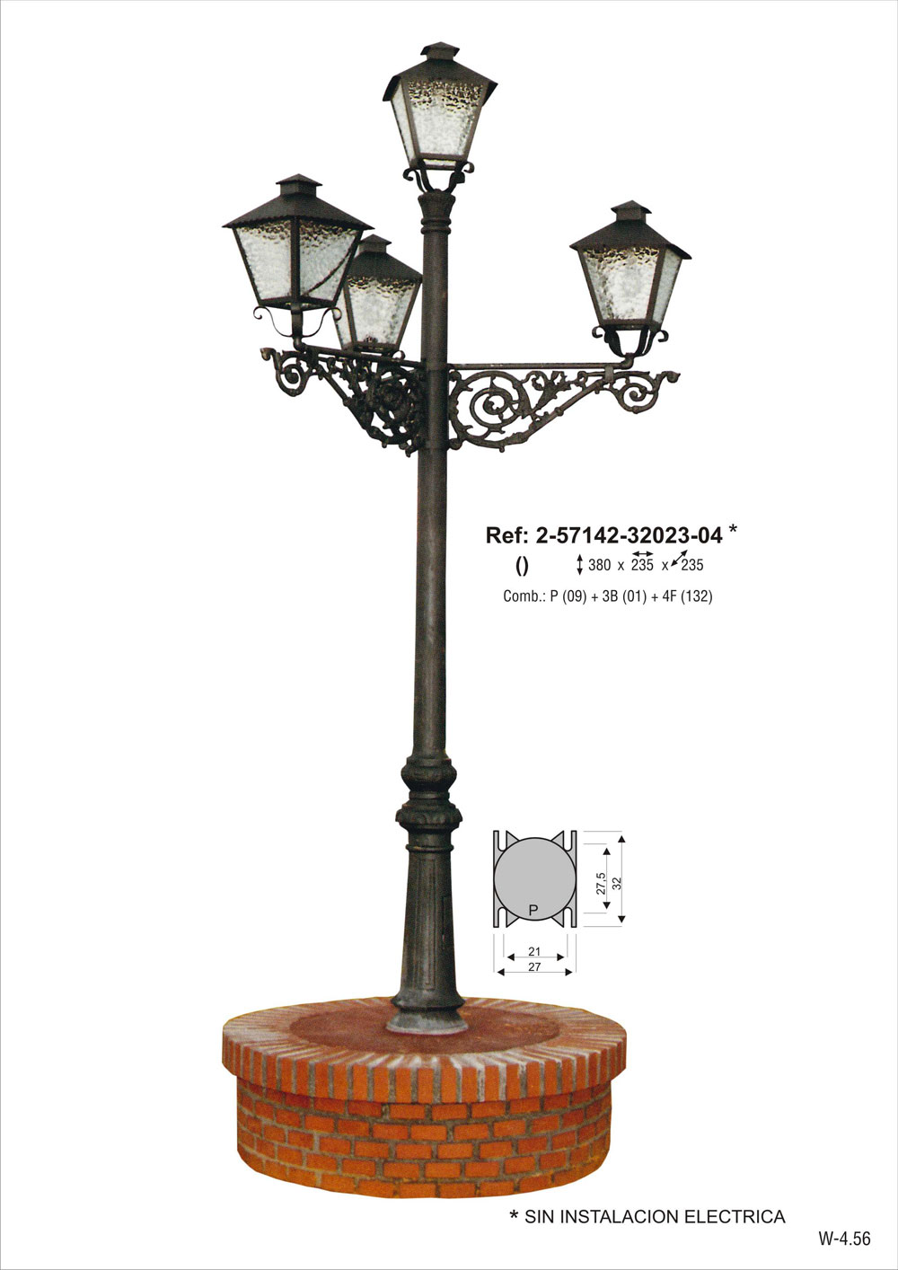 SIN INSTALACION ELECTRICA. Combinación pie villa de fundición de hierro de 320 cm de altura (2-5111-320) + 3 brazos villa grandes de fundición de aluminio (2-9101-97) + 4 faroles de chapa de acero con vidrio carglas (2-4613-5903). Pintado en poliéster termo endurecido. Acabados más habituales en negro, oxirón y verde carruaje.