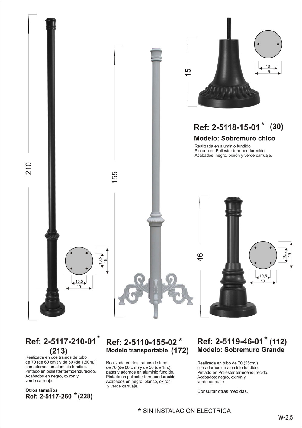 SIN INSTALACION ELECTRICA. Columna modelo transportable. Realizada en dos tramos con tubo de 70 (de 60cm) y de 50 (de 1M) patas y adornos en aluminio fundido. Pintado en poliéster termo endurecido. Acabados más habituales en negro, oxirón y verde carruaje. Fabricado en Andalucía.