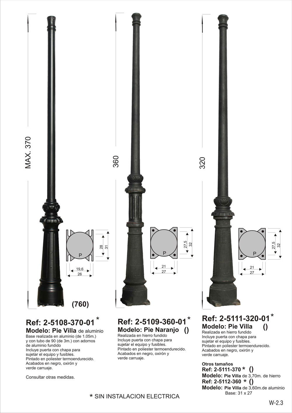 SIN INSTALACION ELECTRICA. Columna modelo Villa. Realizada en hierro fundido. Incluye puerta con chapa soldada para sujetar el equipo y fusibles. Pintado en poliéster termo endurecido. Acabados más habituales en negro, oxirón y verde carruaje.