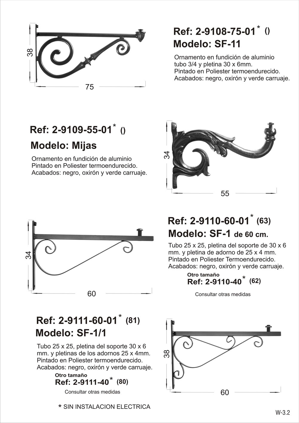 SIN INSTALACION ELECTRICA. Tubo 25x25, pletina del soporte 30x6mm y pletinas de los adornos 25x4mm. Pintado en poliéster termo endurecido. Acabados más habituales en negro, oxirón y verde carruaje. Fabricado en Andalucía.