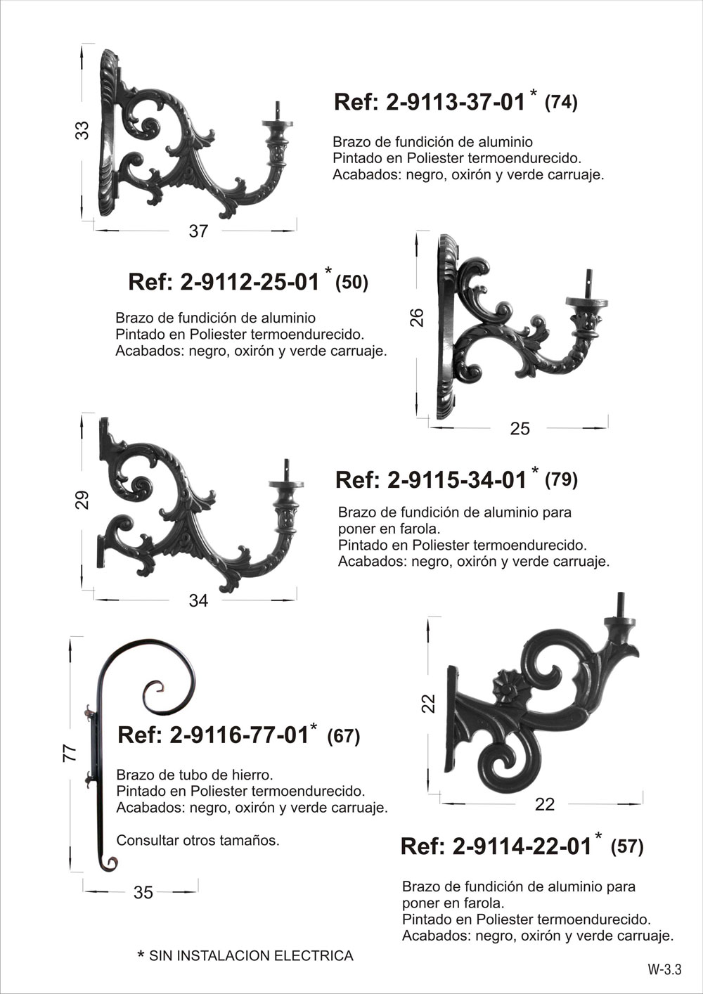 SIN INSTALACION ELECTRICA. Brazo de fundición chico para poner en farola. Pintado en poliéster termo endurecido. Acabados más habituales en negro, oxirón y verde carruaje. Fabricado en Andalucía.