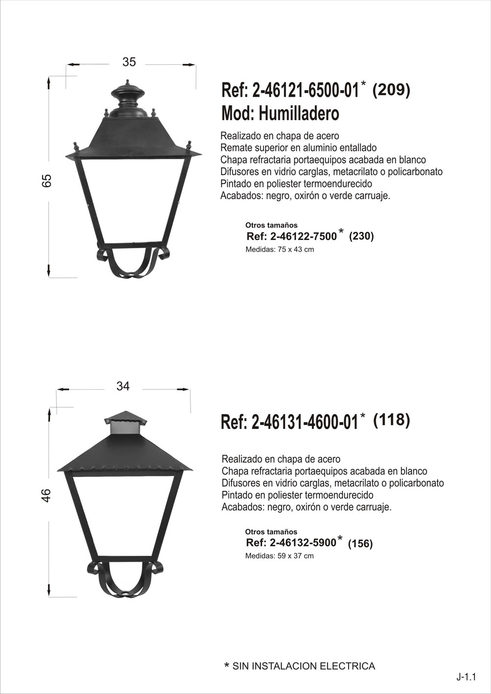 SIN INSTALACION ELECTRICA. Farol chico con pletina y sombrero con doble tejado, realizado en chapa de acero. Chapa refractaria porta equipos acabada en blanco. Difusores en vidrio carglas, metacrilato o policarbonato. Pintado en poliéster termo endurecido. Acabados más habituales en negro, oxirón o verde carruaje. Fabricado en Andalucía.