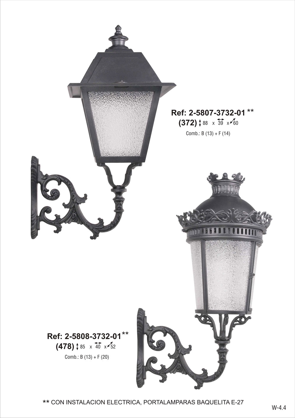 CON INSTALACION ELECTRICA, portalámparas E-27. Combinación brazo de fundición de aluminio grande (2-9113-37) + farol Isabelino chico de fundición de aluminio con metacrilato rugoso (2-4620-6532). Pintado en poliéster termo endurecido. Acabados más habituales en negro, oxirón y verde carruaje.