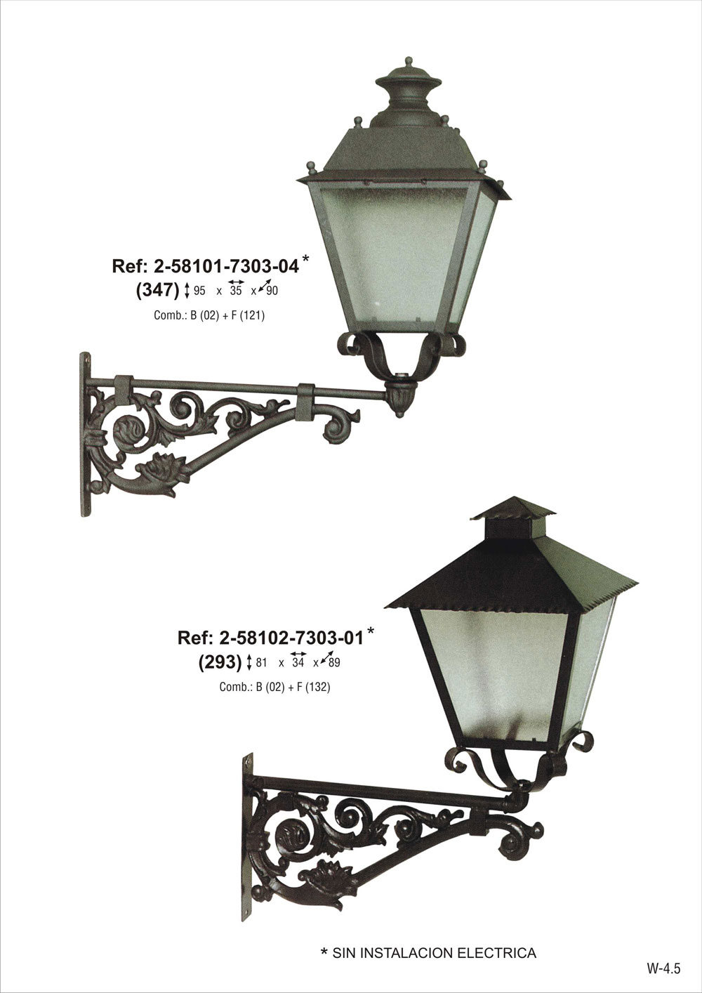 SIN INSTALACION ELECTRICA. Combinación brazo Villa de aluminio fundido (2-9102-73) + farol modelo Humilladero chico de chapa de hierro con vidrio carglas (2-4612-6503). Pintado en poliéster termo endurecido. Acabados más habituales en negro, oxirón y verde carruaje.
