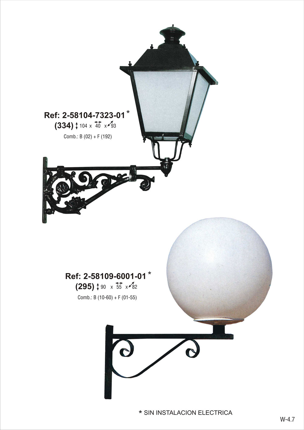 SIN INSTALACION ELECTRICA. Combinación brazo ornamental de hierro (2-9110-60) + bola de polietileno de 55cm de diametro (2-49013-55) + base plato de policarbonato (2-4921-27). Pintado en poliéster termo endurecido. Acabados más habituales en negro, oxirón y verde carruaje.