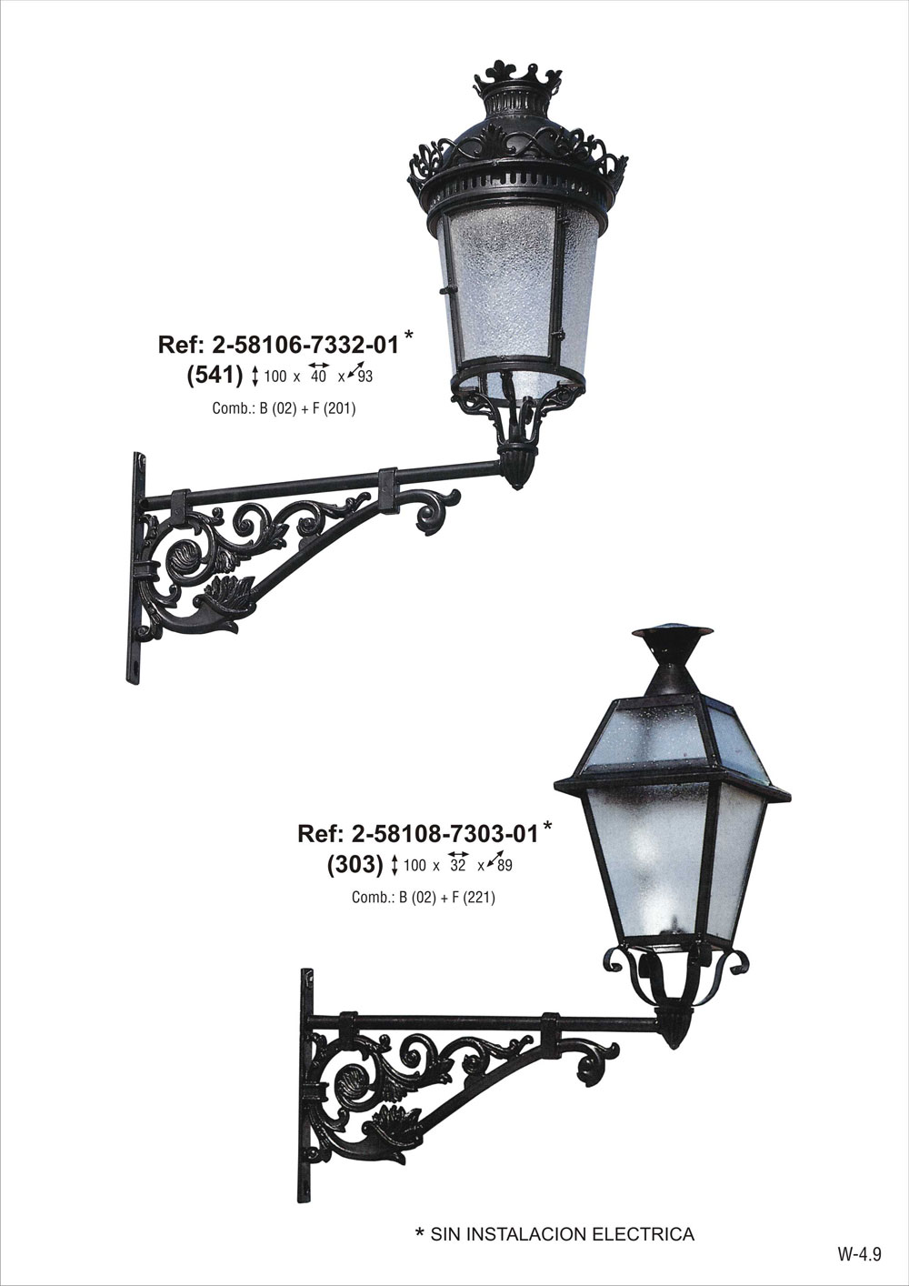 SIN INSTALACION ELECTRICA. Combinación brazo Villa de aluminio fundido (2-9102-73) + farol modelo Antequera chico de chapa de hierro con vidrio carglas (2-46221-6503). Pintado en poliéster termo endurecido. Acabados más habituales en negro, oxirón y verde carruaje.