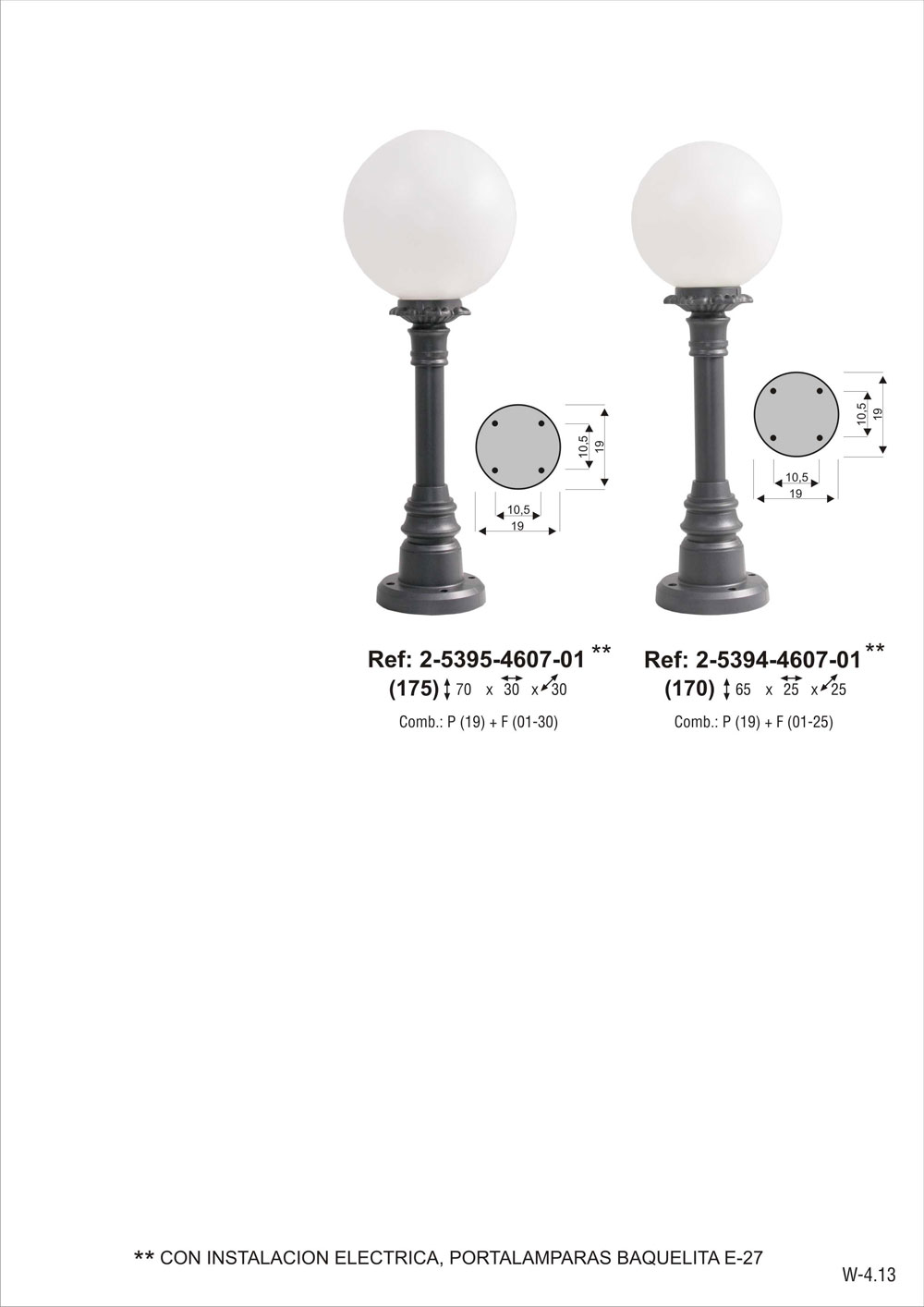 CON INSTALACION ELECTRICA, portalámparas E-27. Combinación sobremuro grande de 46cm de altura (2-5119-46) + bola de polietileno de 25cm de diámetro (2-49011-25) + plato de aluminio (2-4926-27). Pintado en poliéster termo endurecido. Acabados más habituales en negro, oxirón y verde carruaje.