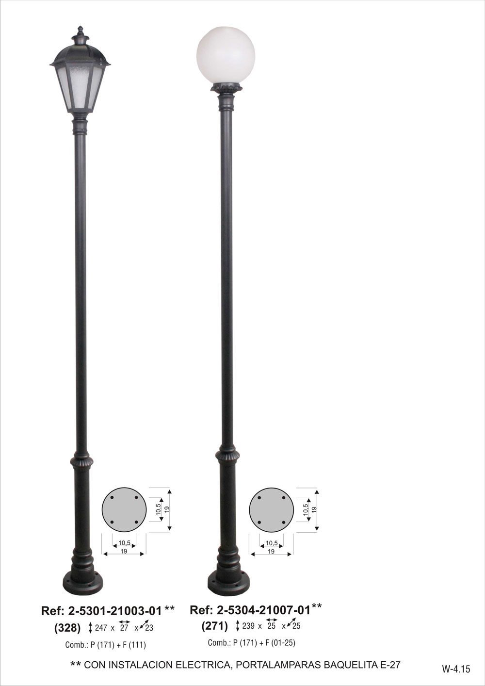 CON INSTALACION ELECTRICA, portalámparas E-27. Combinación pie dos tramos chica de 210 cm de altura (2-5117-210) + farol de 6 caras chico de aluminio fundido con vidrio carglas (2-4611-3603). Pintado en poliéster termo endurecido. Acabados más habituales en negro, oxirón y verde carruaje.