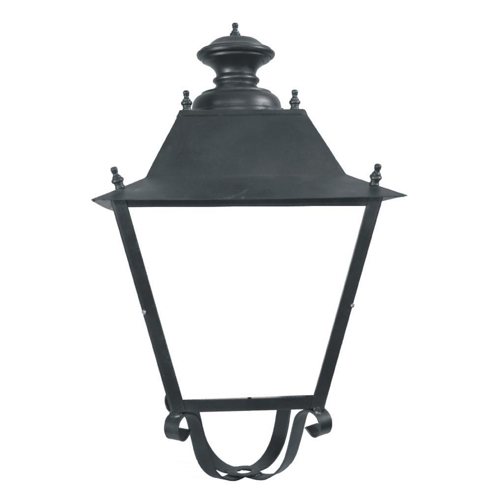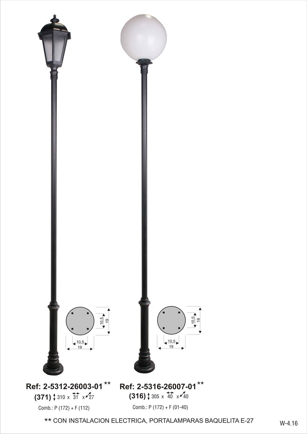CON INSTALACION ELECTRICA, portalámparas E-27. Combinación pie de dos tramos chico de 260 cm de alto (2-5117-260) + farol de 6 caras grande con vidrio carglas (2-4611-4803). Pintado en poliéster termo endurecido. Acabados más habituales en negro, oxirón y verde carruaje.
