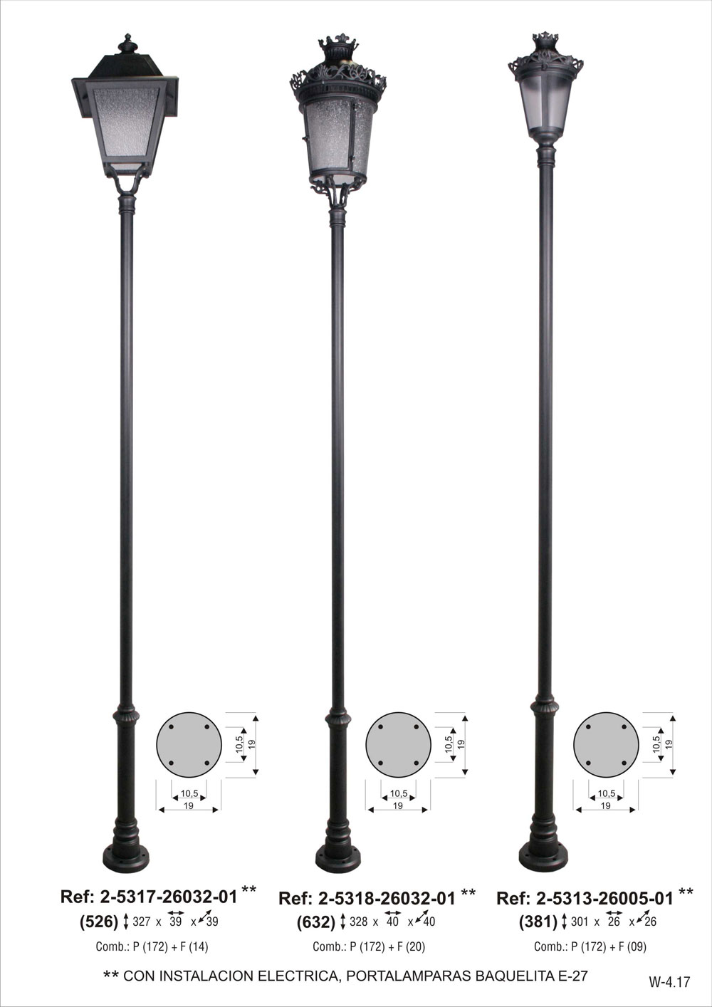 CON INSTALACION ELECTRICA, portalámparas E-27. Combinación pie dos tramos chica de 260 cm de altura (2-5117-260) + farol Isabelino chico de fundición de aluminio con metacrilato rugoso (2-4620-6532). Pintado en poliéster termo endurecido. Acabados más habituales en negro, oxirón y verde carruaje.