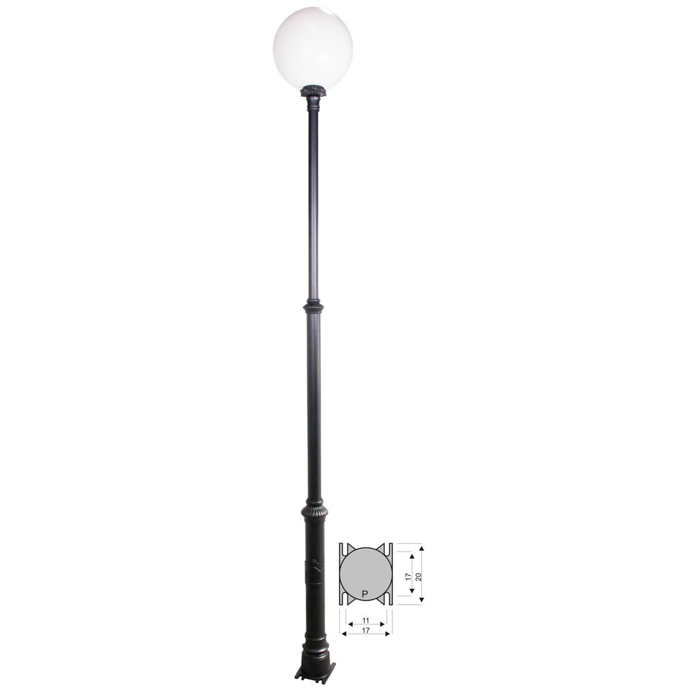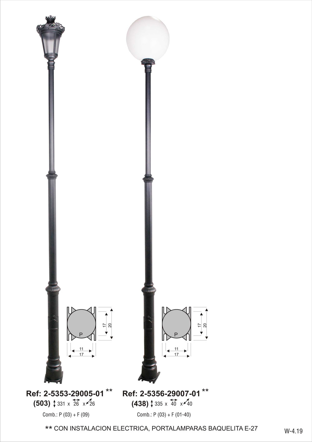 CON INSTALACION ELECTRICA, portalámparas E-27. Combinación pie tres tramos chica de 290 cm de altura (2-5103-290) + bola de polietileno de 40cm de diámetro (2-49011-40) + plato de aluminio (2-4926-27). Pintado en poliéster termo endurecido. Acabados más habituales en negro, oxirón y verde carruaje.