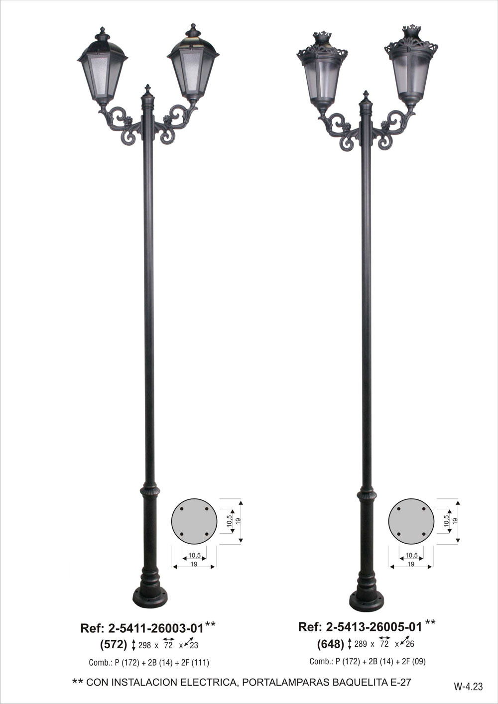CON INSTALACION ELECTRICA, portalámparas E-27. Combinación pie dos tramos chica de 260 cm de altura (2-5117-260) + 2 brazos de fundición de aluminio chicos (2-9114-22) + 2 faroles de 6 caras chico de aluminio fundido con vidrio carglas (2-4611-3603). Pintado en poliéster termo endurecido. Acabados más habituales en negro, oxirón y verde carruaje.