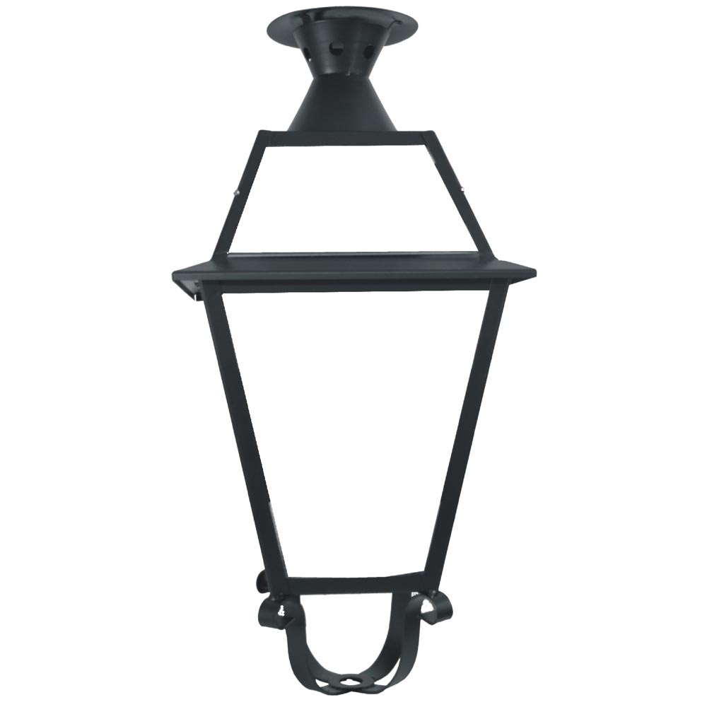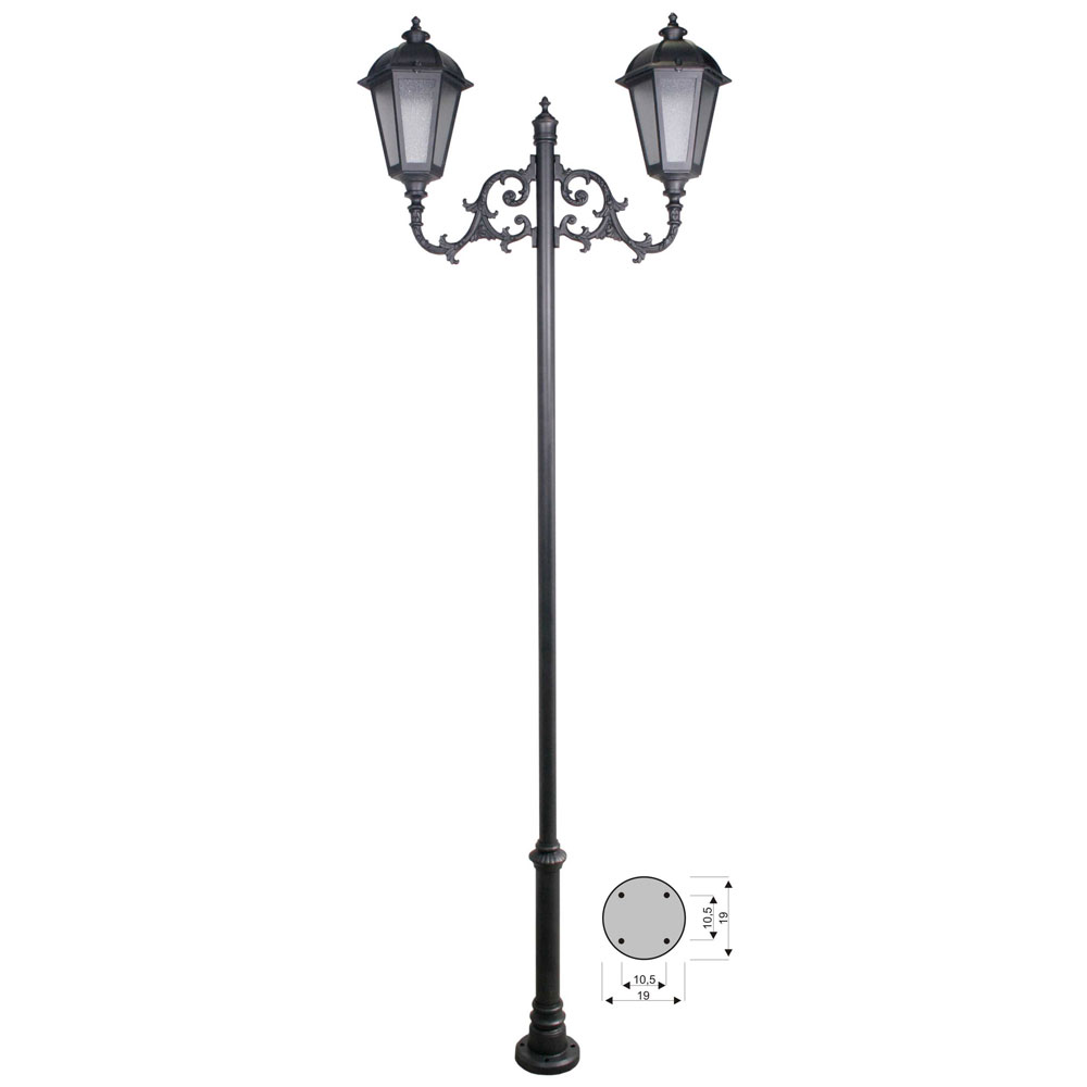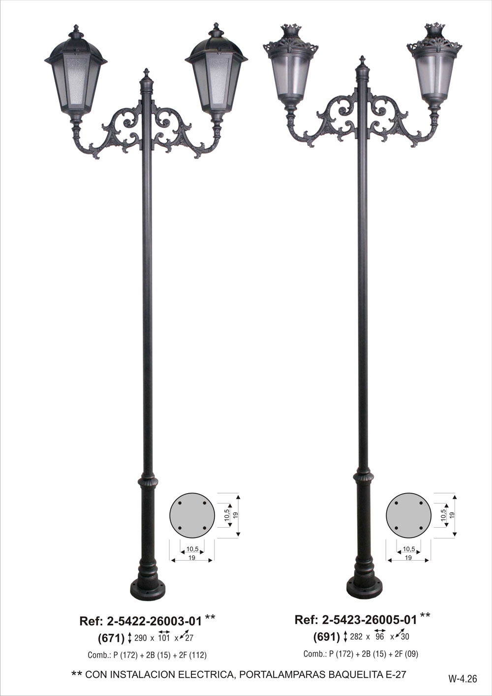 CON INSTALACION ELECTRICA, portalámparas E-27. Combinación pie dos tramos chica de 260 cm de altura (2-5117-260) + 2 brazos de fundición de aluminio grandes (2-9115-34) + 2 faroles de 6 caras grande de aluminio fundido con vidrio carglas (2-4611-4803). Pintado en poliéster termo endurecido. Acabados más habituales en negro, oxirón y verde carruaje.