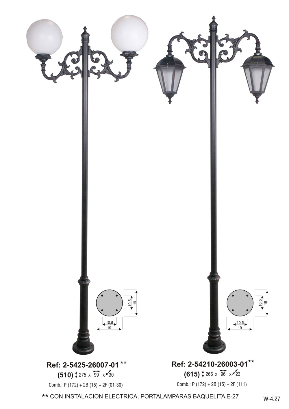CON INSTALACION ELECTRICA, portalámparas E-27. Combinación pie dos tramos chica de 260 cm de altura (2-5117-260) + 2 brazos de fundición de aluminio grandes (2-9115-34) + 2 bolas de polietileno de 30cm de diámetro (2-49011-30) + 2 platos de aluminio (2-4926-27). Pintado en poliéster termo endurecido. Acabados más habituales en negro, oxirón y verde carruaje.