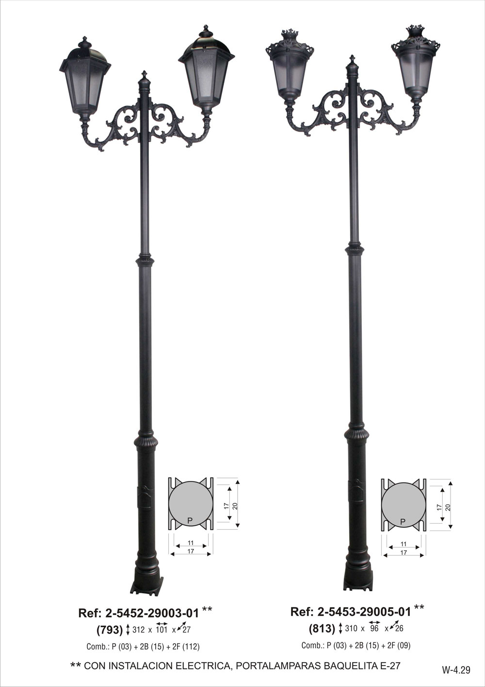 CON INSTALACION ELECTRICA, portalámparas E-27. Combinación pie tres tramos chica de 290 cm de altura (2-5103-290) + 2 brazos de fundición de aluminio grandes (2-9115-34) + 2 faroles redondos en fundición de aluminio con difusor ácido de policarbonato (2-4609-3905). Pintado en poliéster termo endurecido. Acabados más habituales en negro, oxirón y verde carruaje.