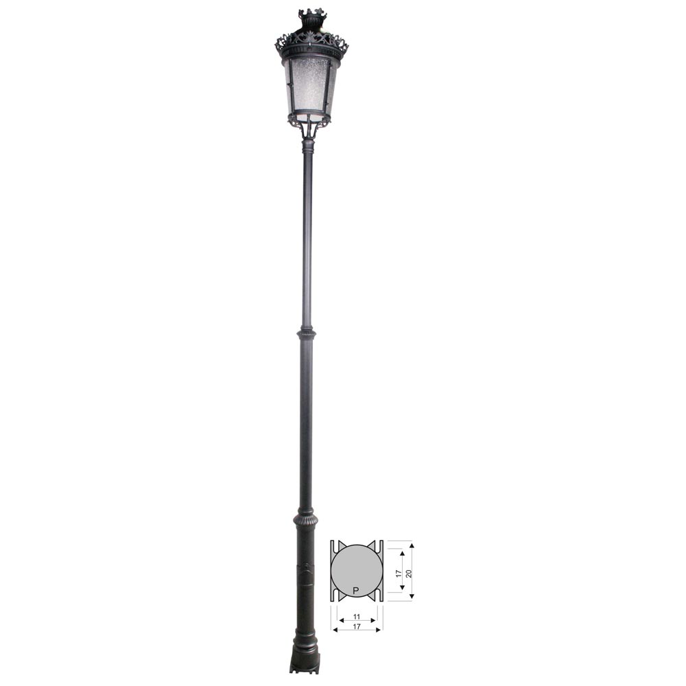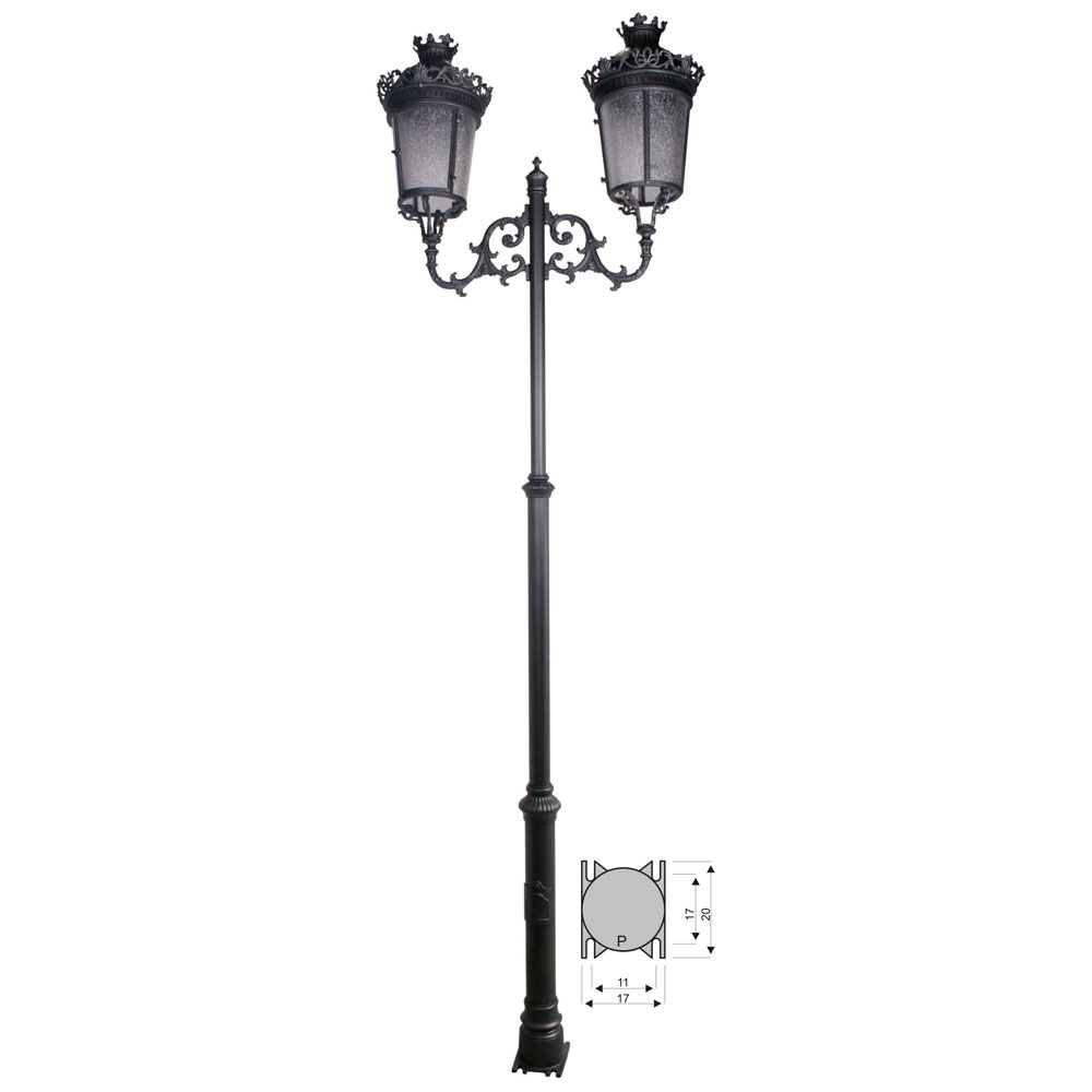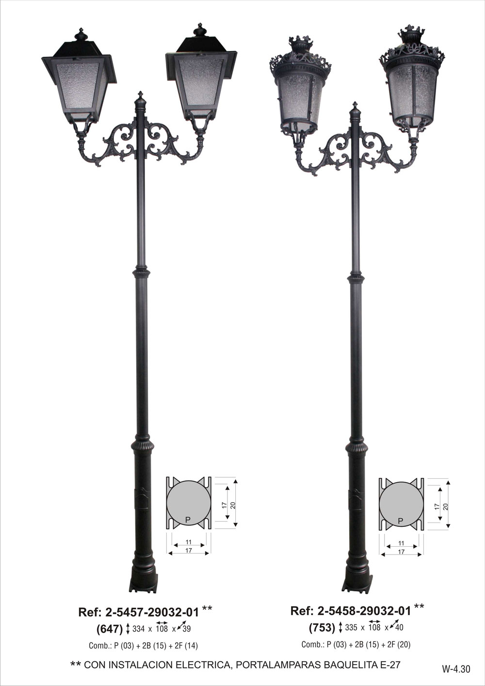 CON INSTALACION ELECTRICA, portalámparas E-27. Combinación pie tres tramos chica de 290 cm de altura (2-5103-290) + 2 brazos de fundición de aluminio grandes (2-9115-34) + 2 faroles Isabelino chico de fundición de aluminio con metacrilato rugoso (2-4620-6532). Pintado en poliéster termo endurecido. Acabados más habituales en negro, oxirón y verde carruaje.