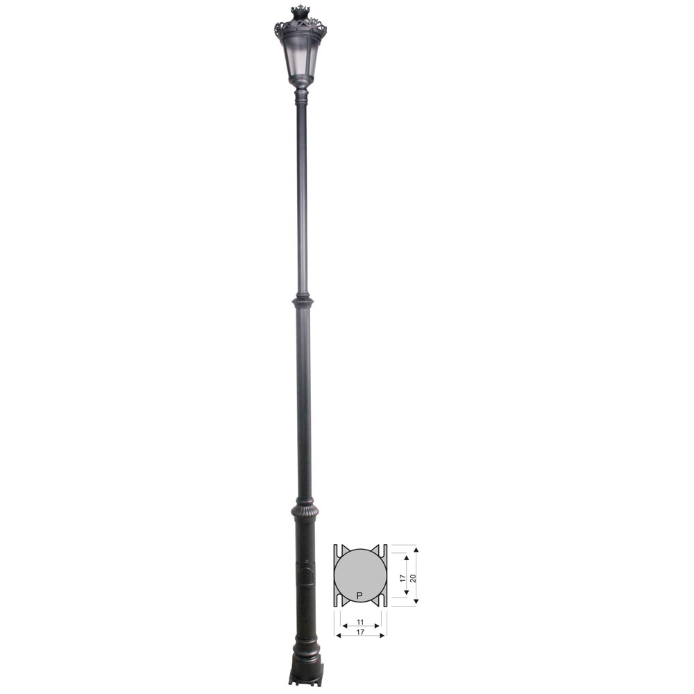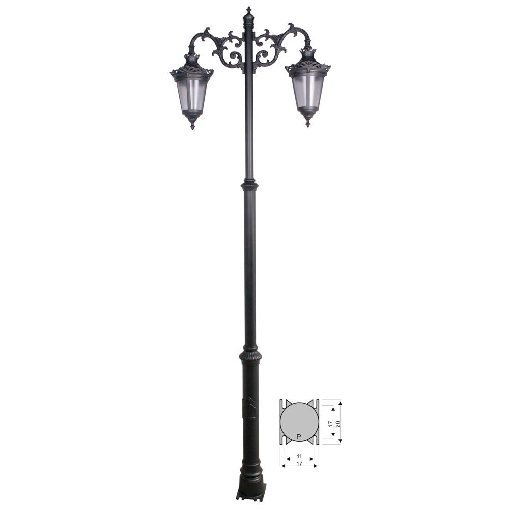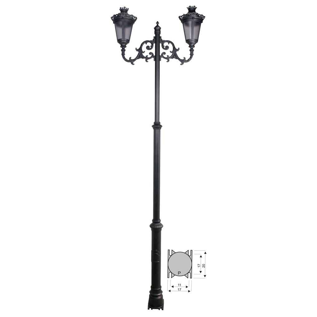 CON INSTALACION ELECTRICA, portalámparas E-27. Combinación pie tres tramos chica de 290 cm de altura (2-5103-290) + 2 brazos de fundición de aluminio grandes (2-9115-34) + 2 faroles redondos en fundición de aluminio con difusor ácido de policarbonato (2-4609-3905). Pintado en poliéster termo endurecido. Acabados más habituales en negro, oxirón y verde carruaje.