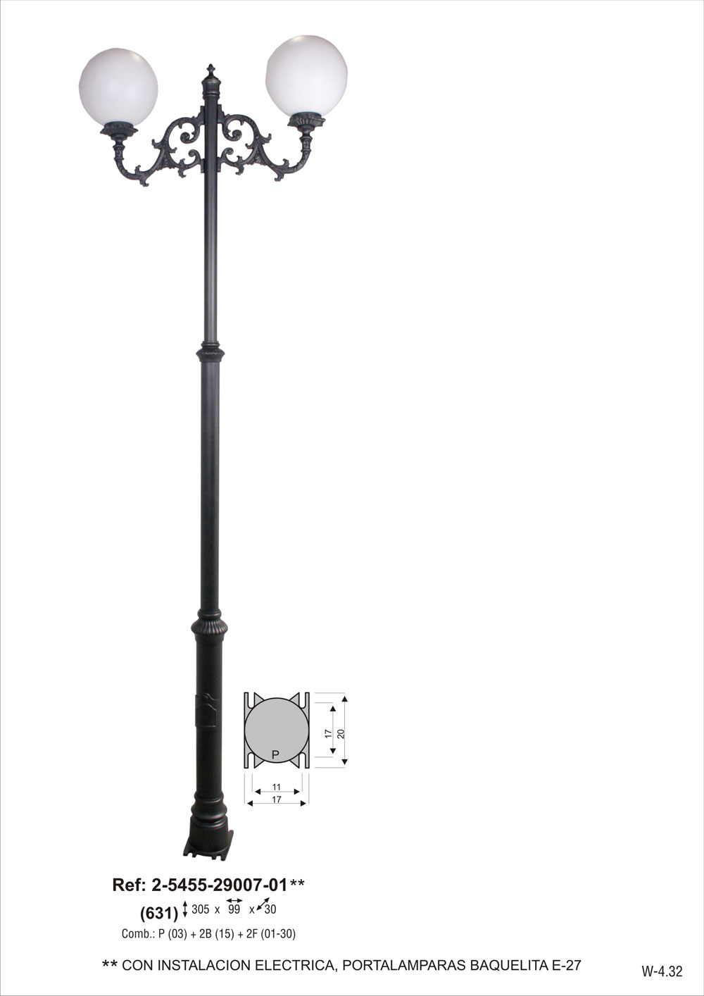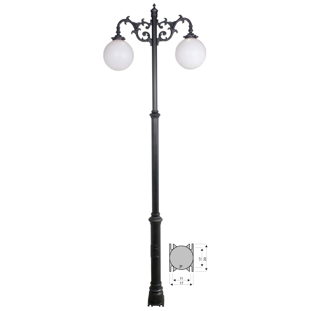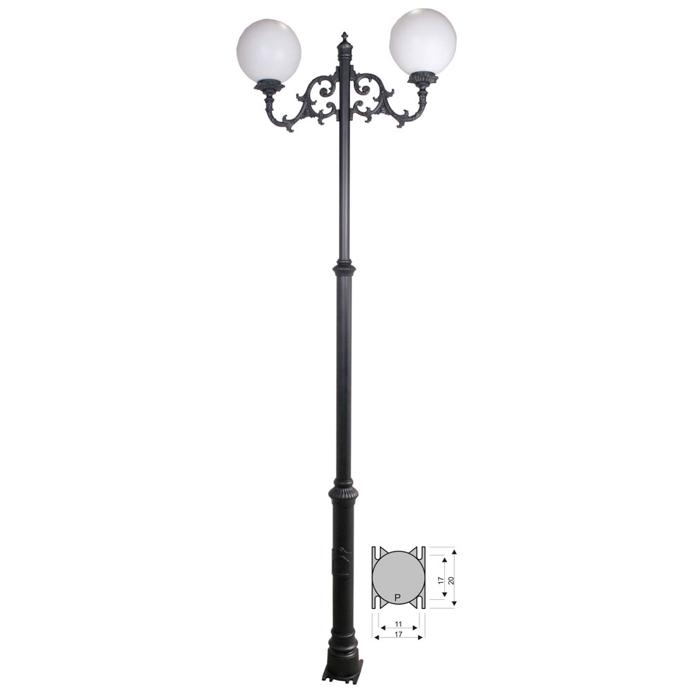 CON INSTALACION ELECTRICA, portalámparas E-27. Combinación pie tres tramos chica de 290 cm de altura (2-5103-290) + 2 brazos de fundición de aluminio grandes (2-9115-34) + 2 bolas de polietileno de 30cm de diámetro (2-49011-30) + 2 platos de aluminio (2-4926-27). Pintado en poliéster termo endurecido. Acabados más habituales en negro, oxirón y verde carruaje.