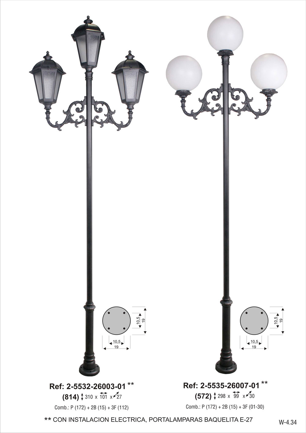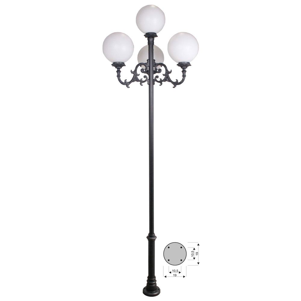 CON INSTALACION ELECTRICA, portalámparas E-27. Combinación pie dos tramos chica de 260 cm de altura (2-5117-260) + 2 brazos de fundición de aluminio grandes (2-9115-34) + 3 bolas de polietileno de 30cm de diametro (2-49011-30) + 3 platos de aluminio (2-4926-27). Pintado en poliéster termo endurecido. Acabados más habituales en negro, oxirón y verde carruaje.