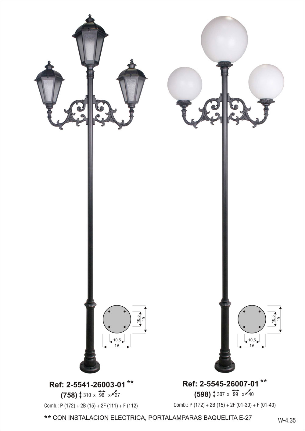 CON INSTALACION ELECTRICA, portalámparas E-27. Combinación pie dos tramos chica de 260 cm de altura (2-5117-260) + 2 brazos de fundición de aluminio grandes (2-9115-34) + 2 faroles de 6 caras chico de aluminio fundido con vidrio carglas (2-4611-3603) + farol de 6 caras grande de aluminio fundido con vidrio carglas (2-4611-4803). Pintado en poliéster termo endurecido. Acabados más habituales en negro, oxirón y verde carruaje.